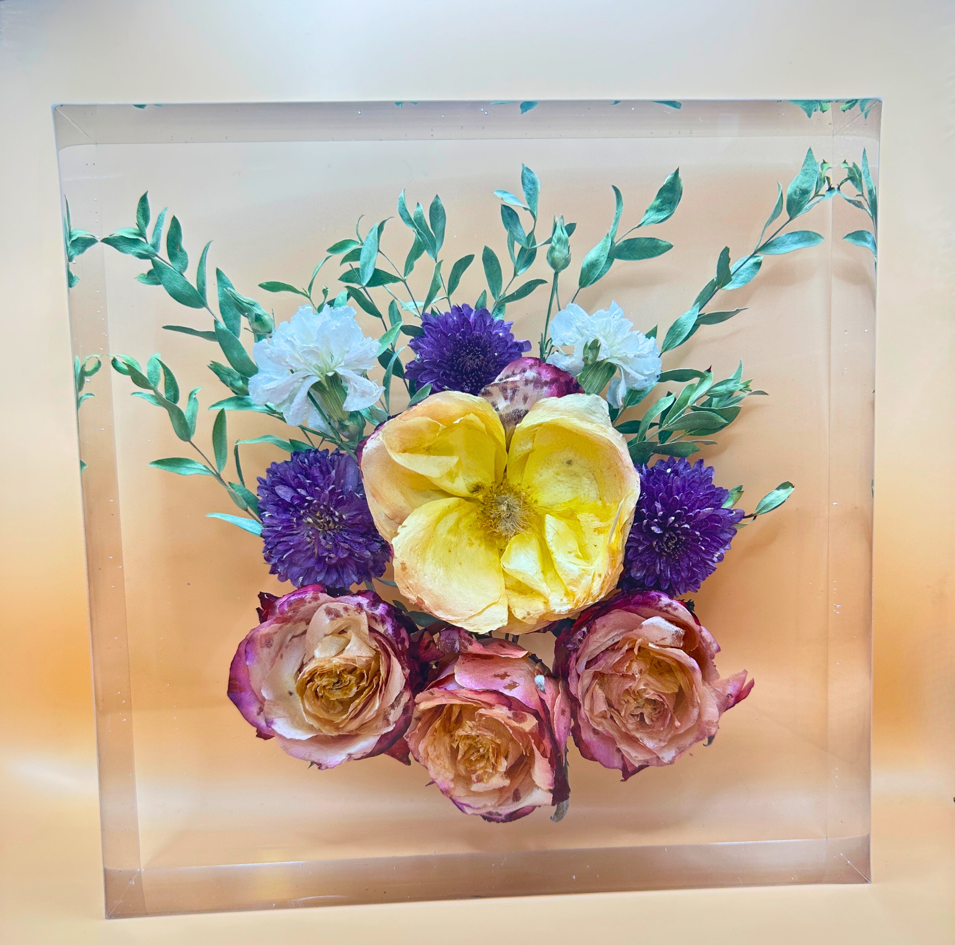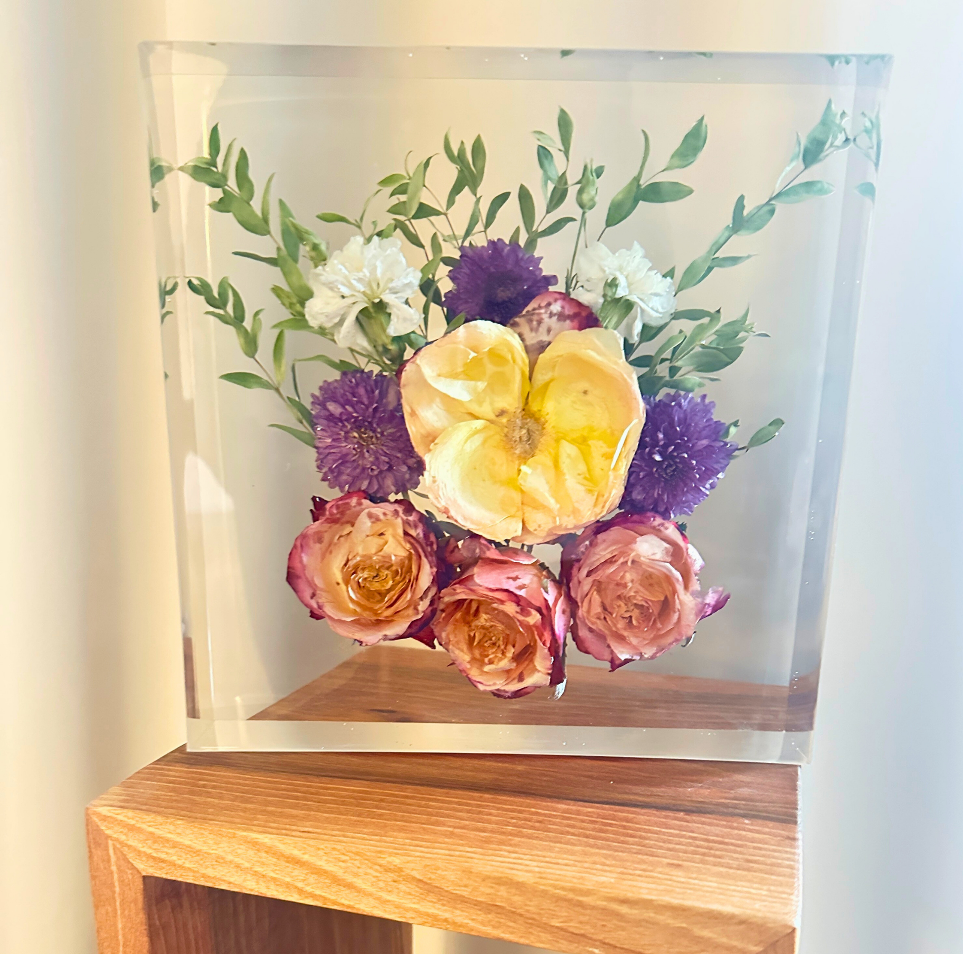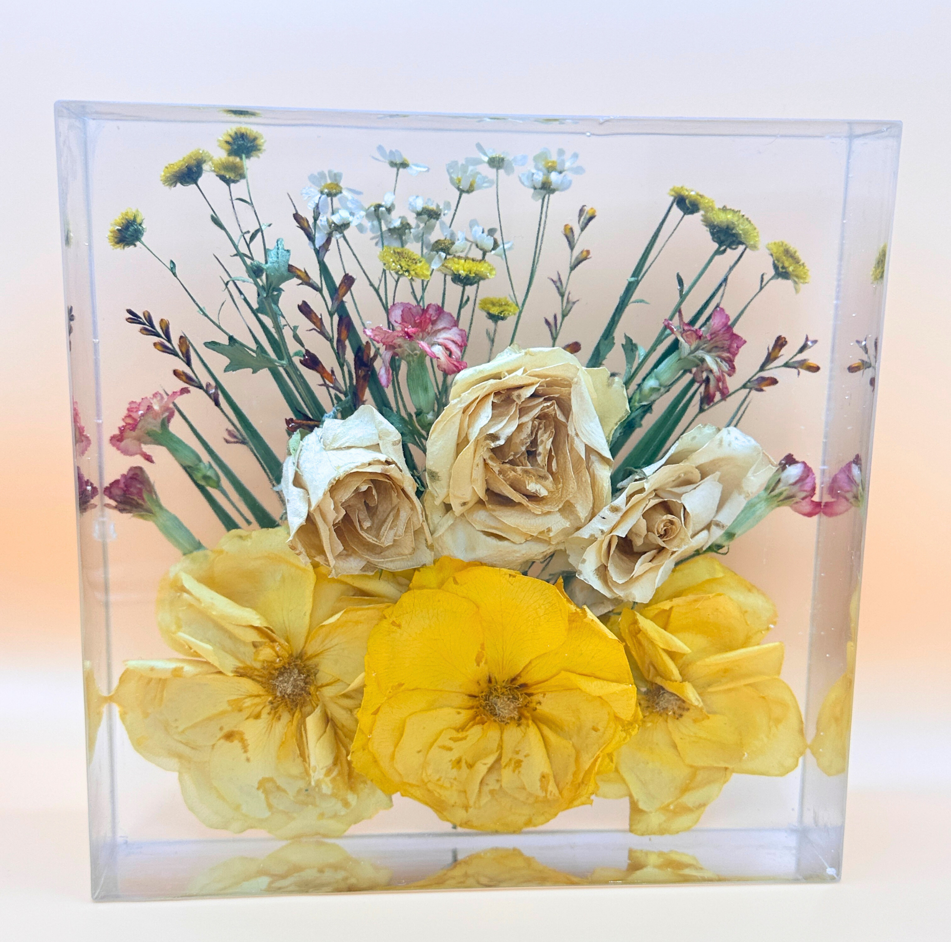 Sorgfältig arrangierte Blüten deines Brautstrausses werden in klarem Epoxidharz verewigt – ein Kunstwerk, das Liebe sichtbar macht.