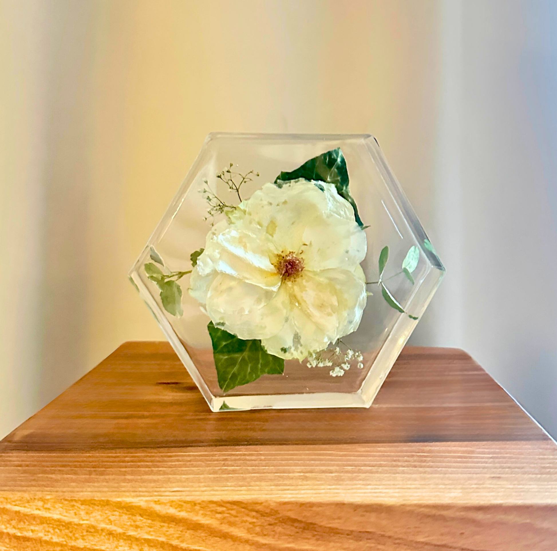 Die Blüten werden sorgfältig getrocknet, arrangiert und im klaren Epoxidharz verewigt – ein stilvolles Erinnerungsstück voller Harmonie.